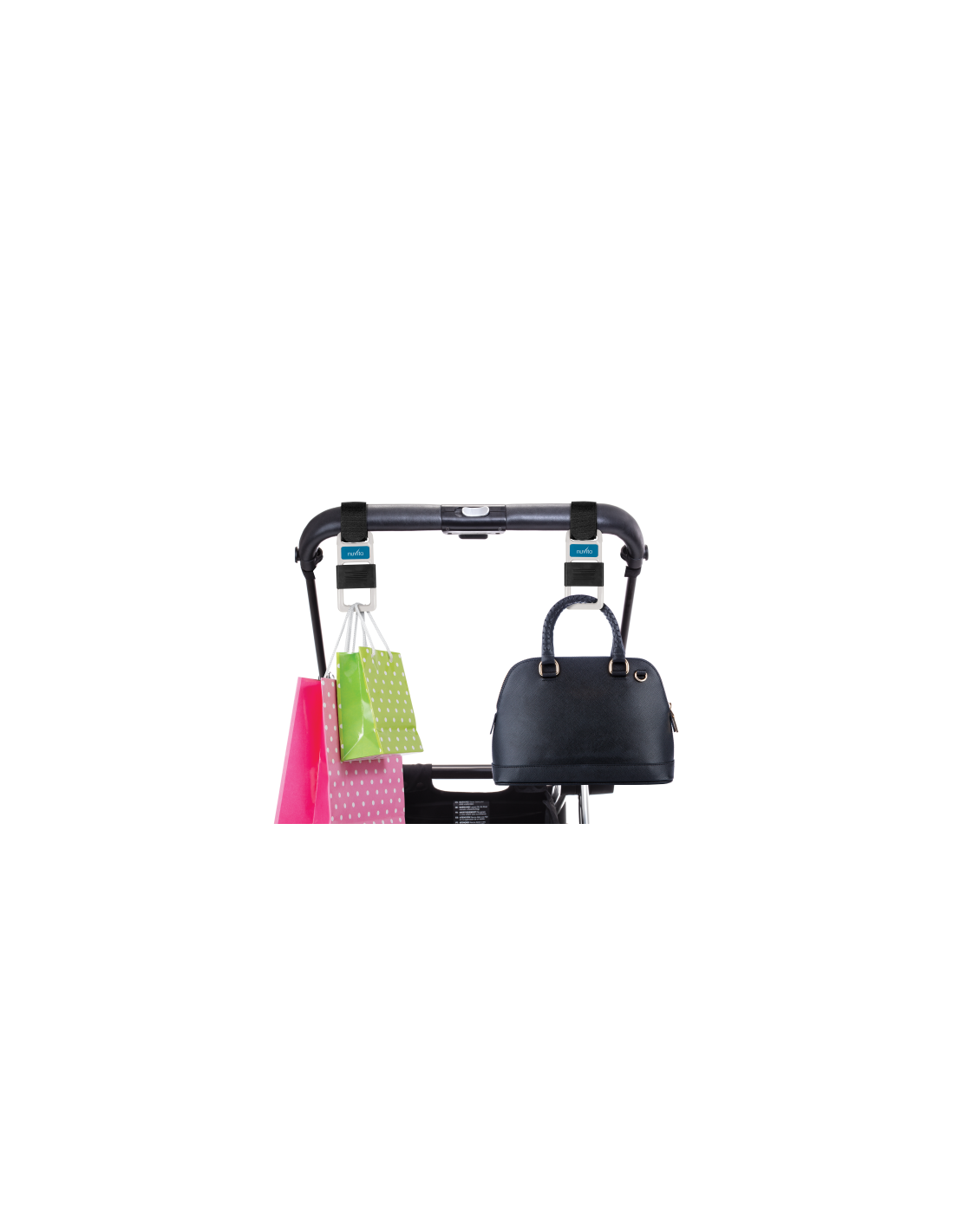 Set 2 ganci con chiusure di sicurezza anti-scivolo adatti per la maggior parte di modelli di passeggini. Comodi per trasportare senza fatica la borsa mamma,la spesa, etc.
