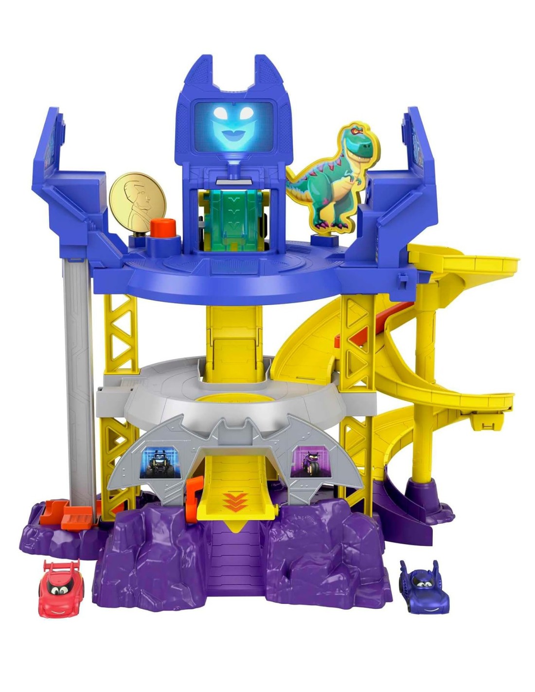 Ispirata alla Batcaverna della serie, questa pista da corsa giocattolo presenta 3 piani di gioco, un ascensore per far sfrecciare le macchinine intorno al set, una pista a spirale e luci, suoni e frasi super cool.