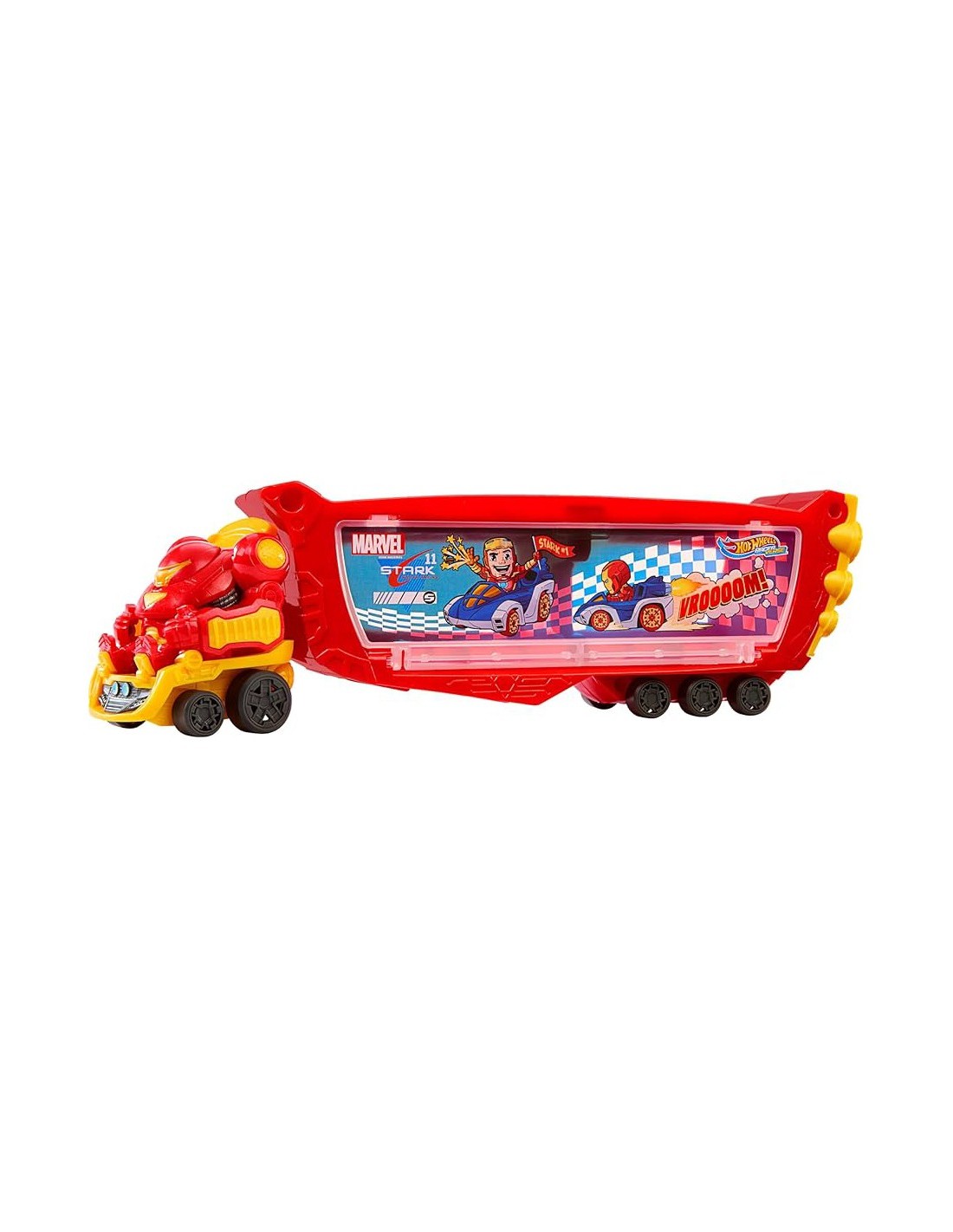 Questo trasportatore a tema Iron Man presenta una grafica Stark Racing e può contenere fino a 10 veicoli Hot Wheels RacerVerse o macchinine Hot Wheels in scala 1:64 per giocare o esporre.