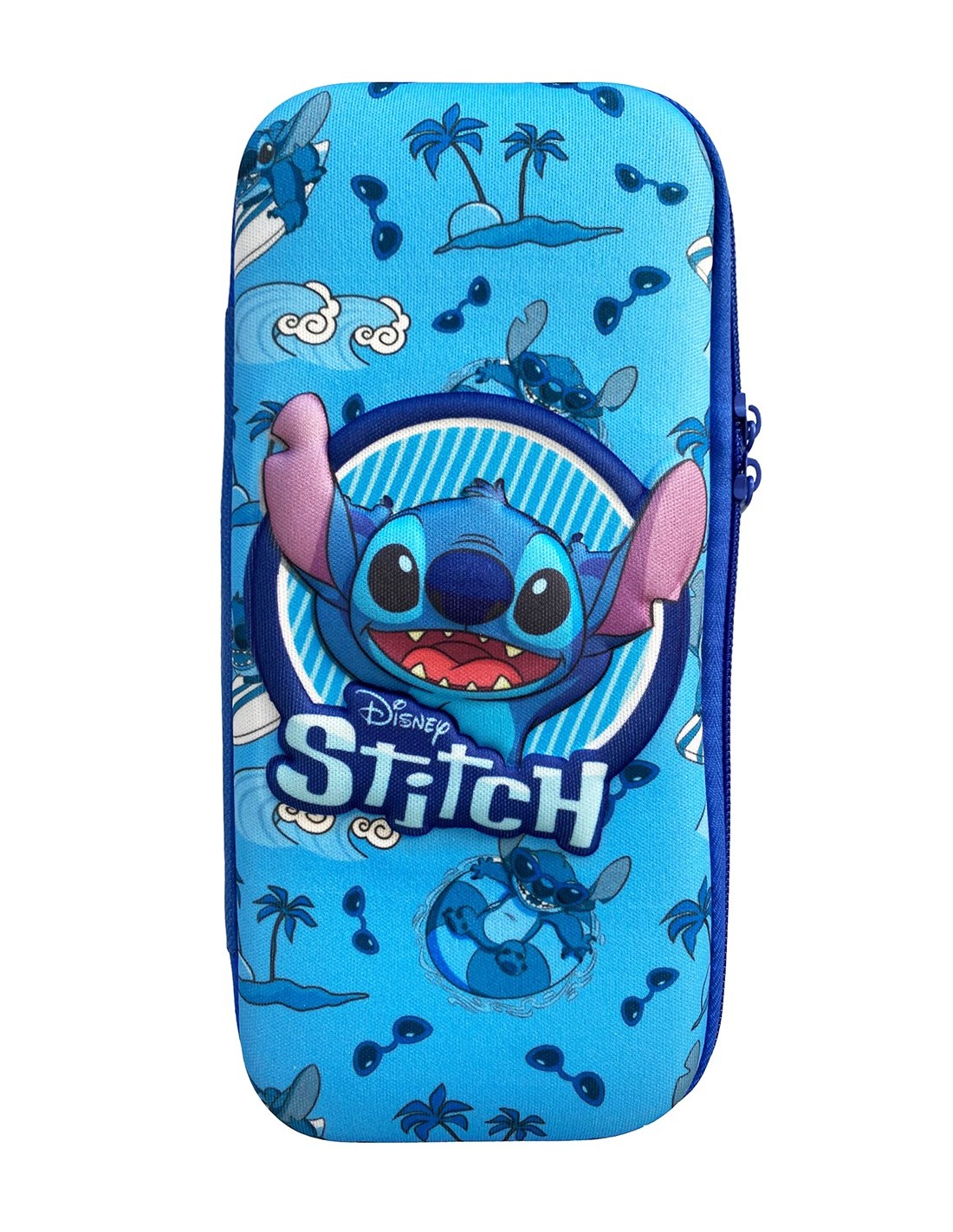 L'astuccio presenta un design accattivante con un sorridente Stitch in rilievo su una base di altri Stitch e decorazioni varie, il tutto contornato da una zip blu
