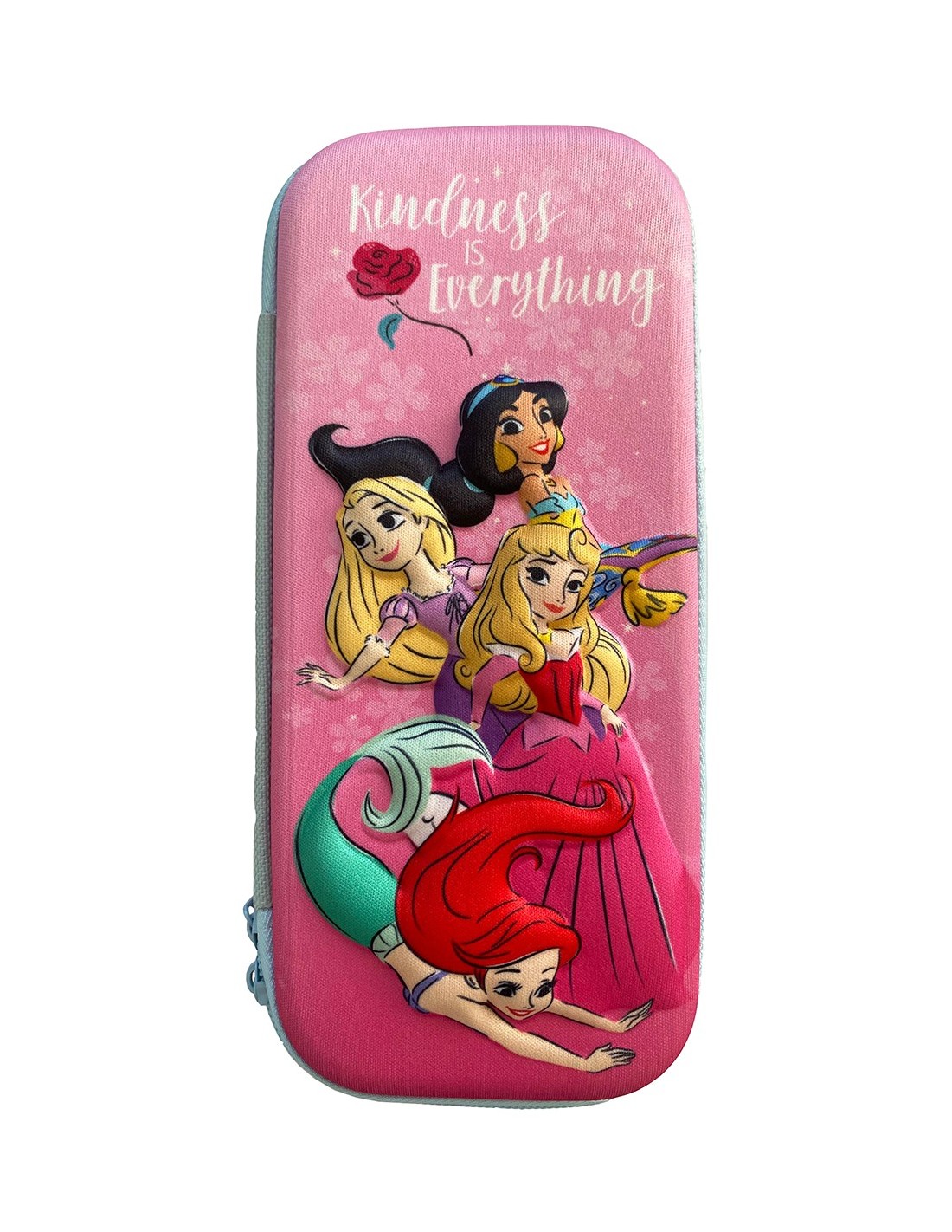 L'astuccio presenza un design accattivante con Jasmine, Rapunzel, Aurora e Ariel in rilievo su una base rosa a fiorellini, il tutto contornato da una zip azzurra