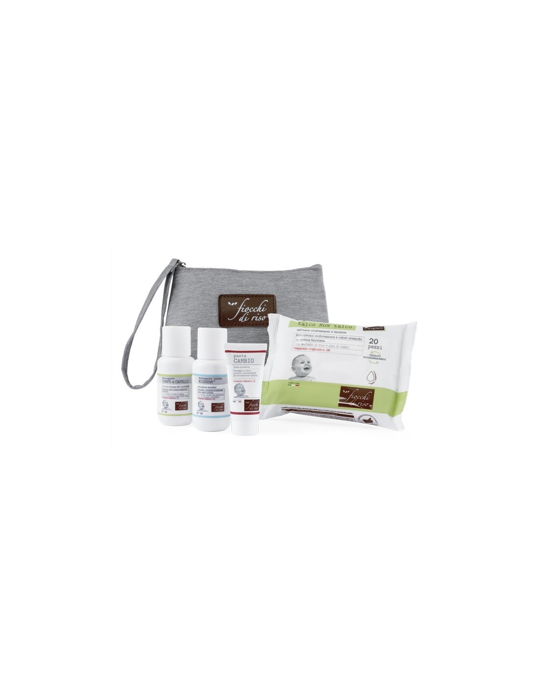 Il cofanetto bebè Fiocchi di Riso include una pratica pochette, dall'ampio spazio interno impermeabile, realizzata in morbido tessuto foderato, con eleganti finiture e chiusura a zip.