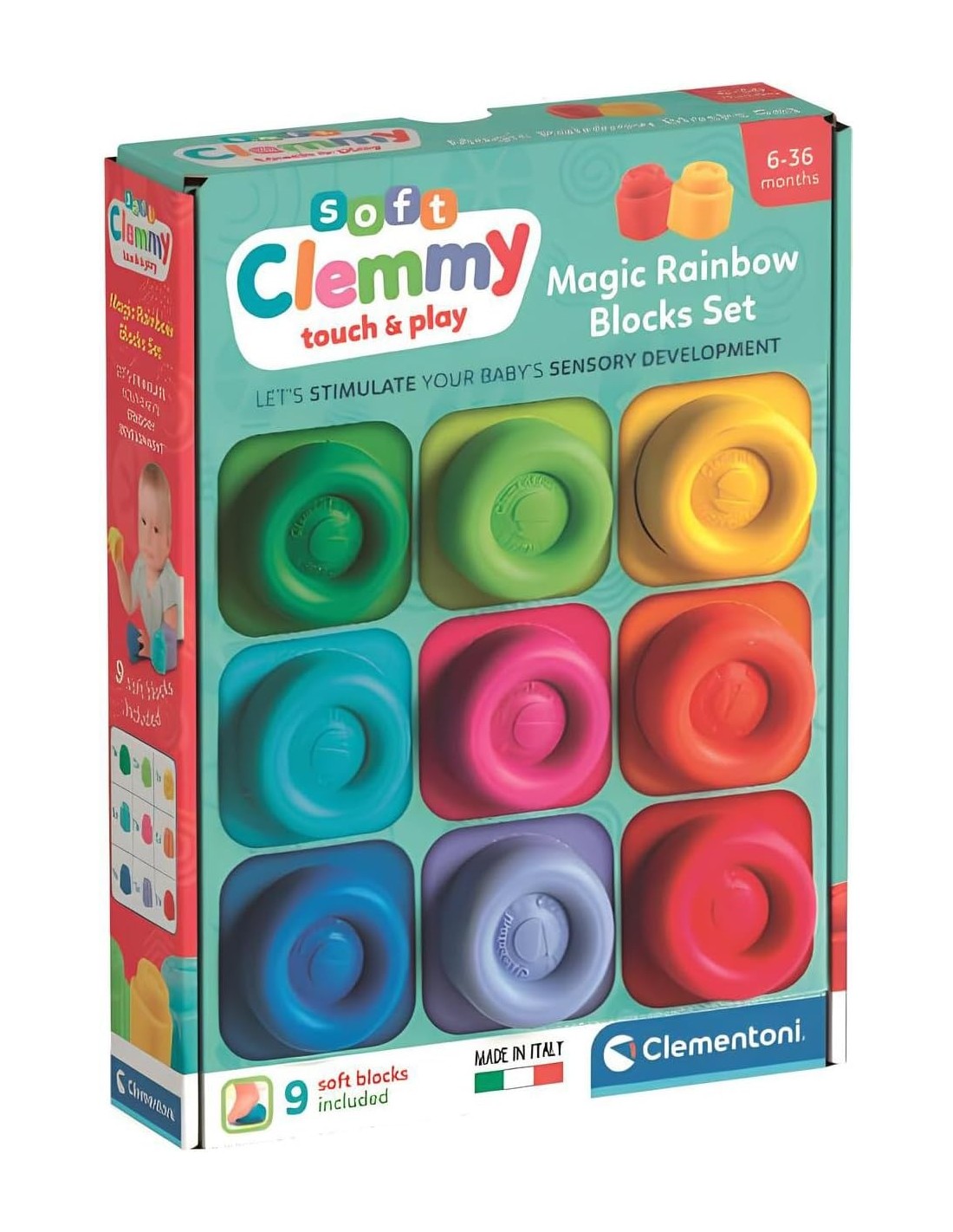 Tutto parte da un mattoncino. Un set da 9 mattoncini Clemmy morbidissimi e coloratissimi, perfetti per far scoprire ai più piccoli il piacere di toccare, creare torri e schiacciare.