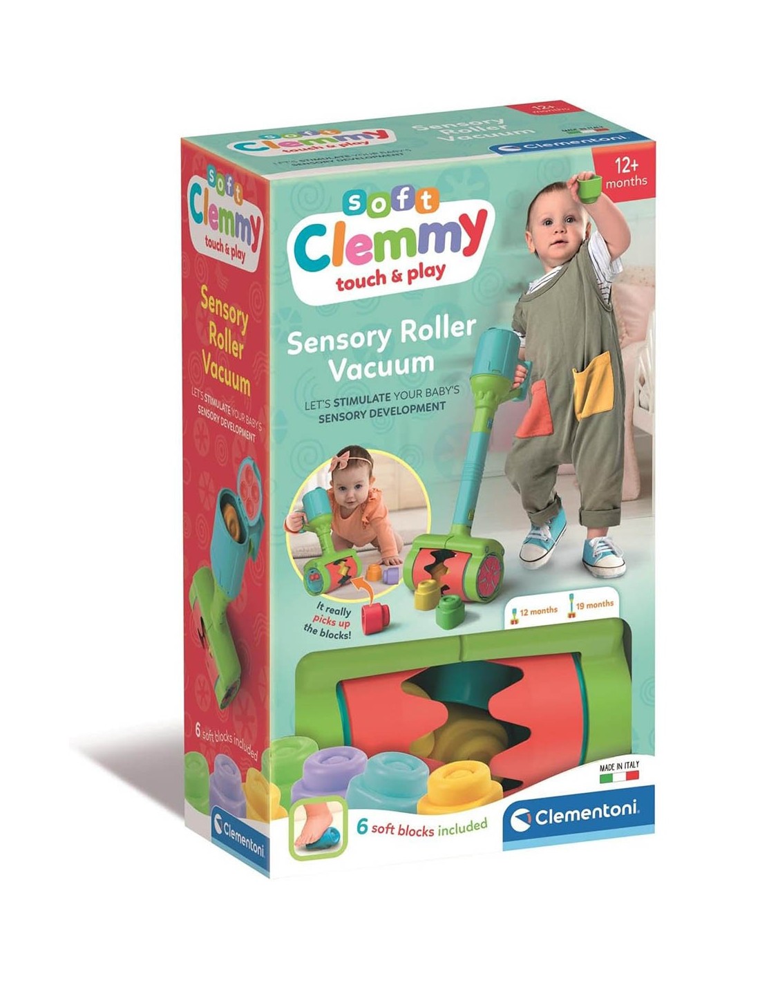 Il playset contiene 6 mattoncini morbidi Clemmy e grazie alle diverse texture e inserti in materiale morbido sviluppa la percezione tattile del bambino.