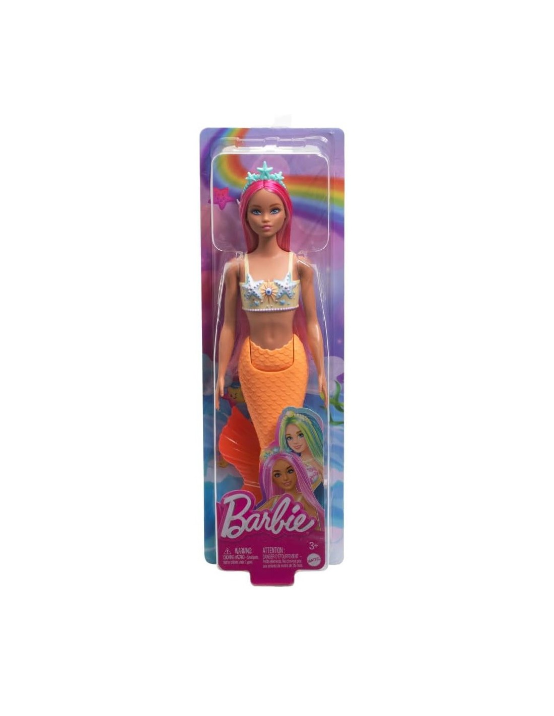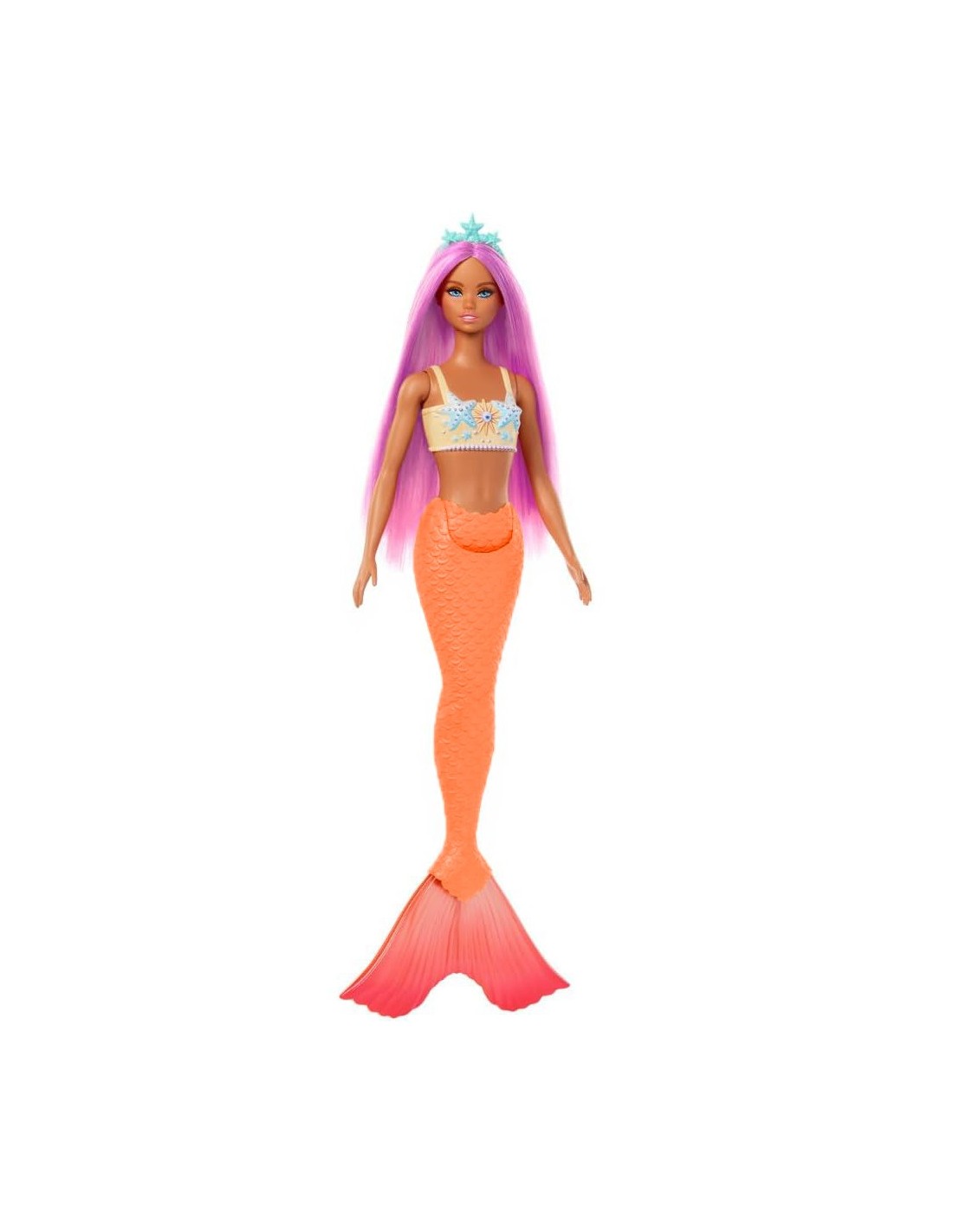 Barbie Sirena presenta uno splendido corpetto ispirato alle stelle marine e una morbida coda arancione con pinna sfumata!