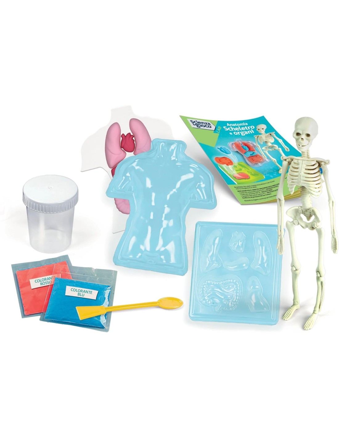 Attraverso stampini e polveri colorate incluse nel kit è possibile riprodurre degli organi gelatinosi; la riproduzione in plastica dello scheletro umano e dei sistemi anatomici in cartone permettono di posizionare gli organi correttamente