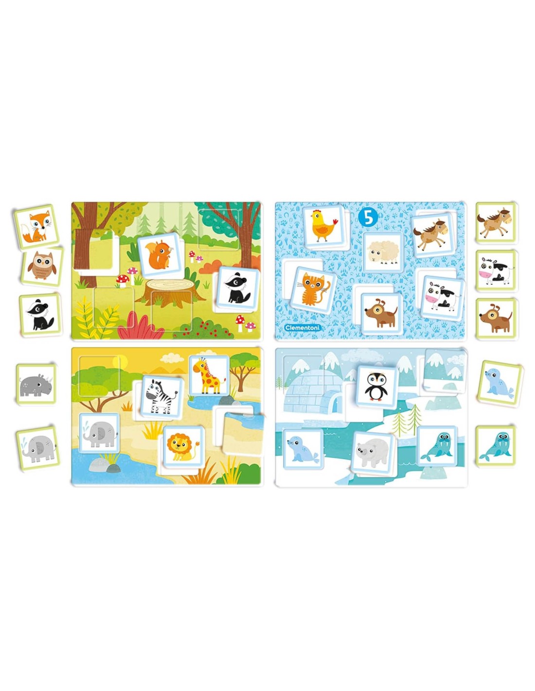 Include 5 schede ambienti e 60 tessere con 30 coppie di animali, per giocare da soli o in compagnia.