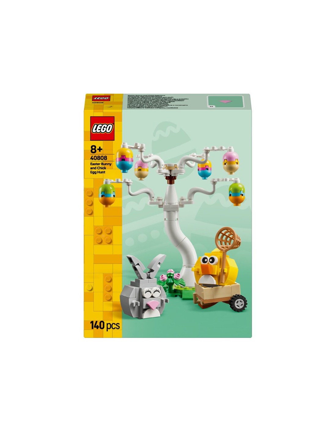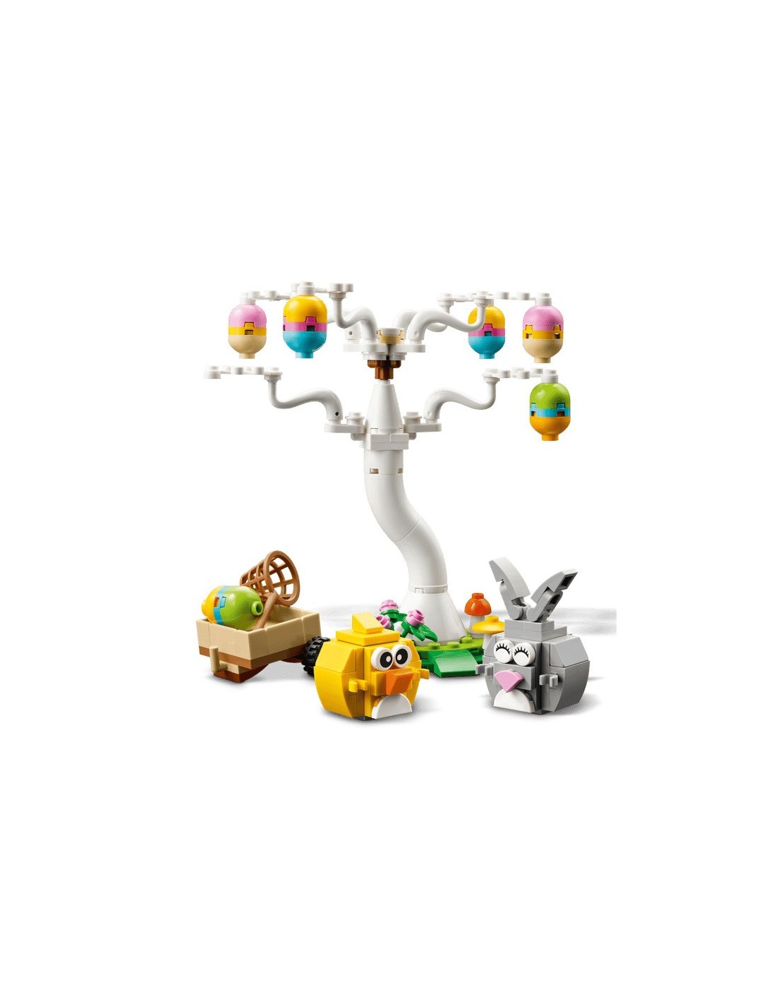 Assembla l’albero, il carretto, l’uccello e il coniglio Lego, quindi costruisci e appendi le uova dai colori vivaci ai rami dell’albero affinché gli animali possano trovarle.
