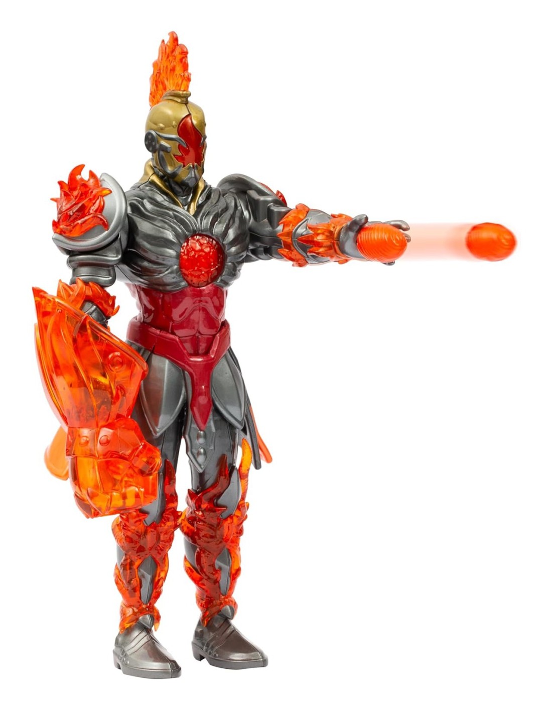 L'action figure dei Gormiti, Fireon da 27 cm, riproduce con grande precisione il personaggio della serie “Gormiti The New Era”, con dettagli curati e colori metallizzati rosso e argento.