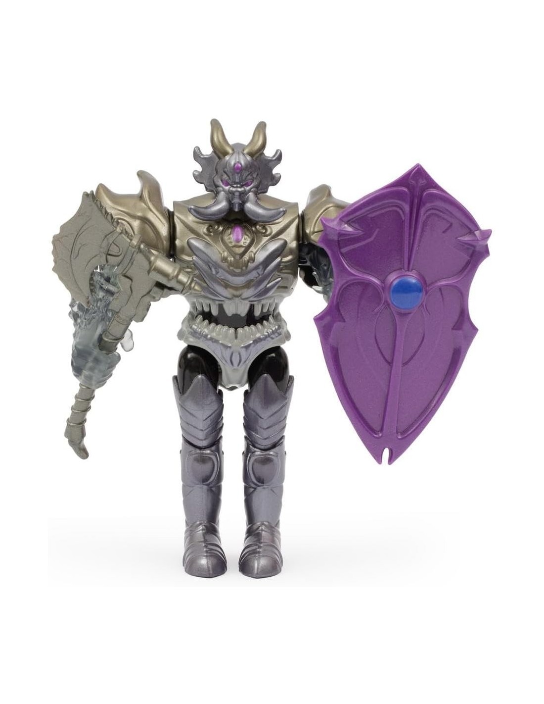 Il personaggio è dotato di arma da combattimento e scudo viola, perfetti per ricreare scontri avvincenti e avventure entusiasmanti.