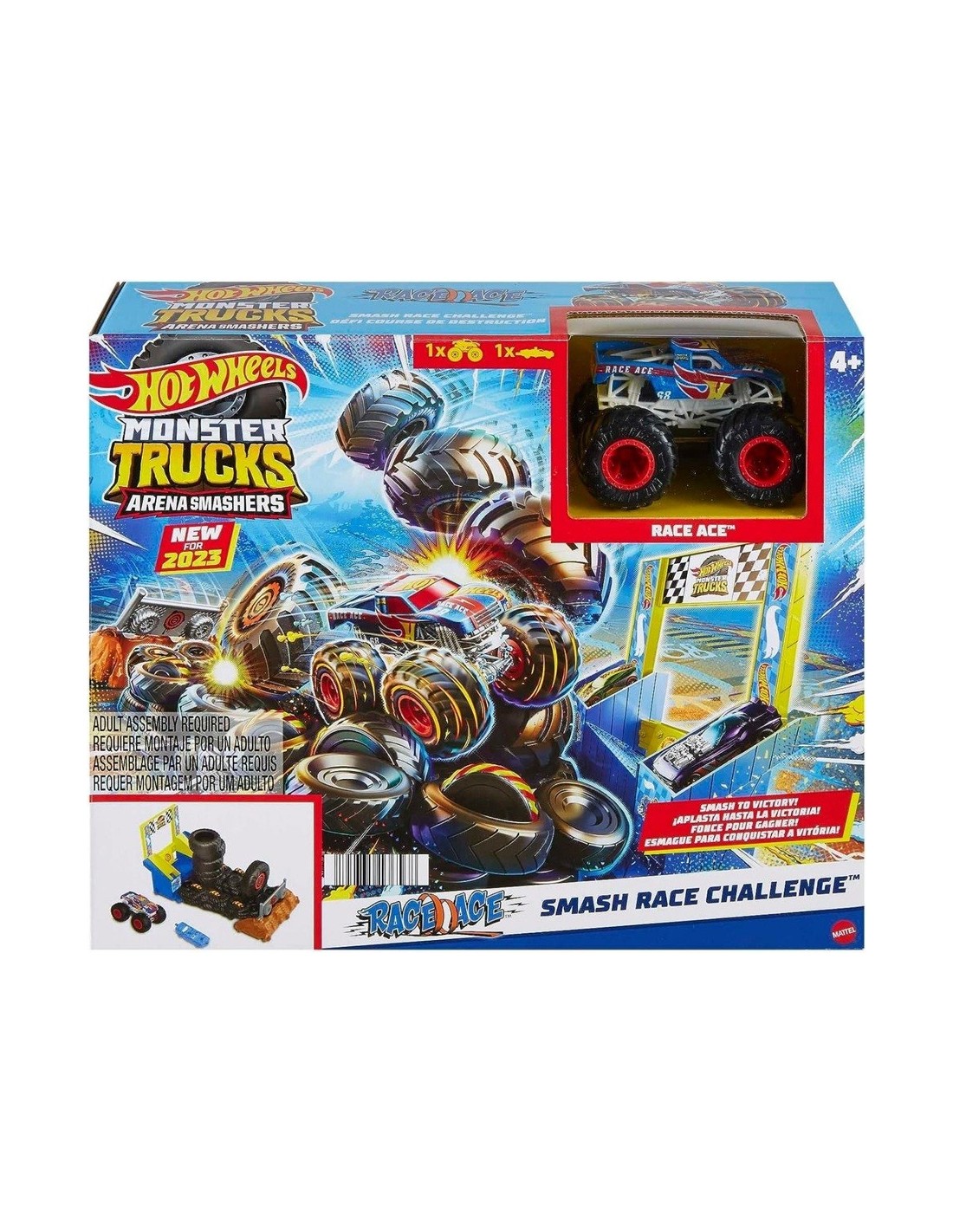 Con la sfida Hot Wheels Monster Trucks Arena Smashers Race Ace Smash Race, i bambini guidano Race Ace in vari punti di collisione per abbattere una torre di pneumatici e demolire la concorrenza.