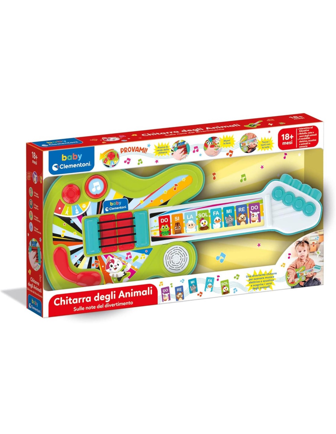 Rock and roll formato baby. Impugnatura cool e 3 modalità di gioco - elettrica, acustica, animali - per far sentire ogni bambino una piccola rockstar... all'insegna del divertimento!
