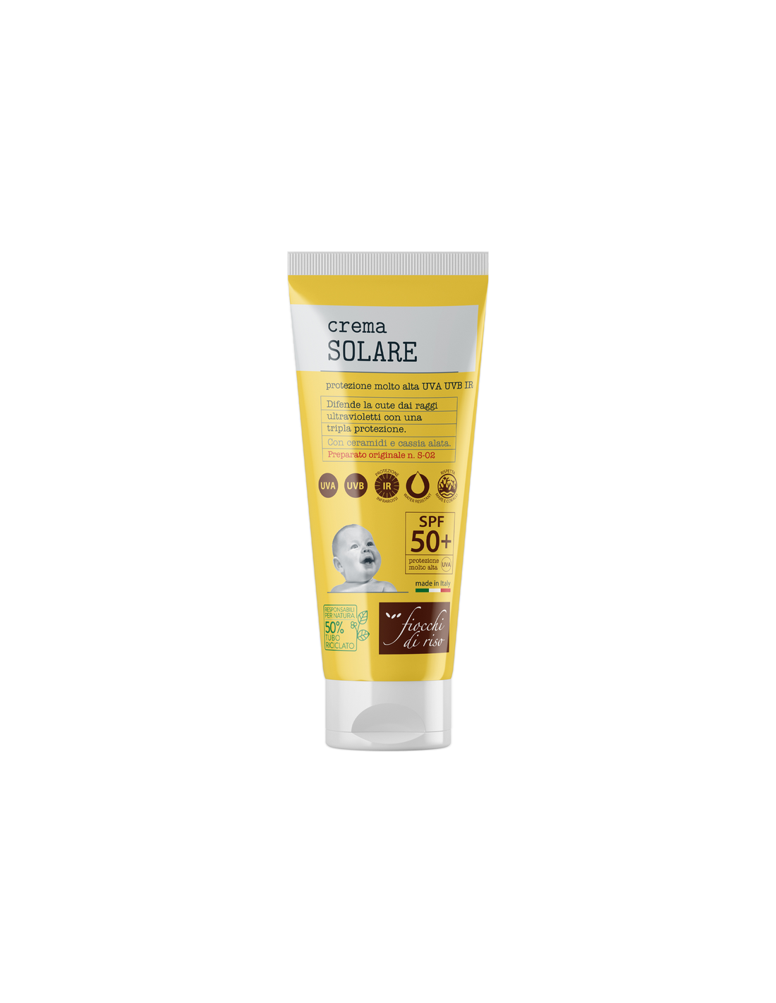 La crema solare Fiocchi di Riso è un preparato originale specifico per l'alta protezione (SPF 50+) dalle radiazioni UVA, UVB e IR della pelle ipersensibile di neonati e bambini.
