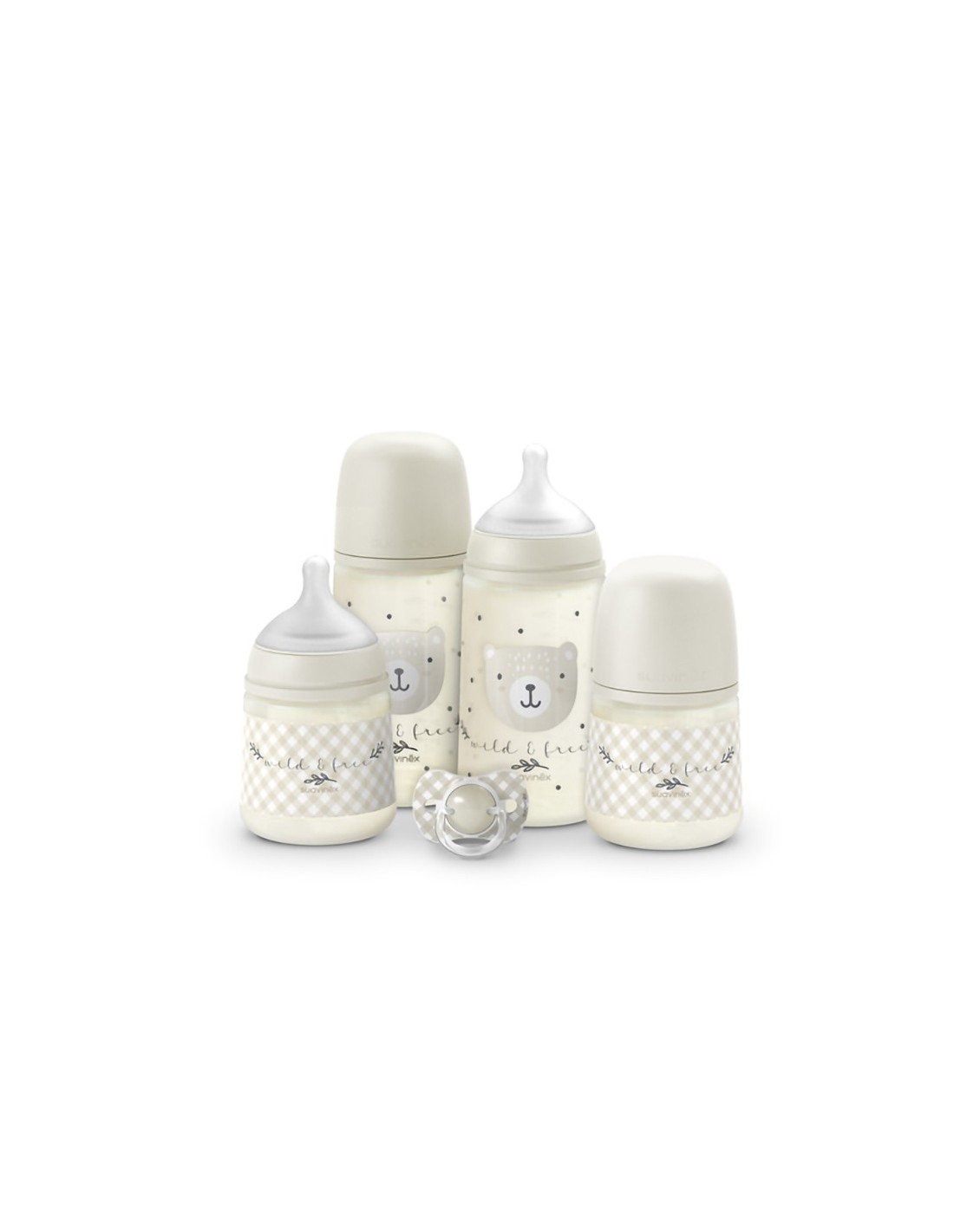 2 Biberon 150 ml con tettarella fisiologica in silicone, flusso S. Il foro stretto permette il passaggiodi piccole quantità di liquido. Ideale per le poppate di latte nei primi giorni